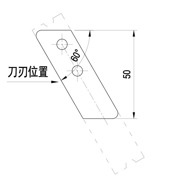 大規(guī)格波紋管間隙式剖開工裝采用的是兩端固定的方式,在支架與裁切槽上分別螺栓連接。對于小規(guī)格波紋管,此種連接方式,存在明顯的問題,即裁切槽上設置的螺栓需要通過波紋管內(nèi)孔,螺栓的大小需要保證能整體通過波紋管。AD21.2及以下波紋管內(nèi)孔較小,螺栓橫向不能無接觸通過,因此,大規(guī)格波紋管刀片的連接方式不適用于小規(guī)格波紋管。在設計小規(guī)格波紋管間隙式剖開工裝時,考慮到軟管內(nèi)徑較小,刀片固定時,支架上可用螺栓固定,而刀片下端直接接觸軟管,無位置固定刀片,故設計成刀片緊靠裁切槽,同時,為了保證刀片固定的可靠性,與支架連接時,采用雙螺栓連接,且保證兩螺栓之間有一定間距,使雙刀固定可靠,可抵抗軟管沖擊力。另外,為了方便刀片位置的調(diào)節(jié),破口刀設有固定圓孔,固定圓孔為兩組,而支架上的固定破口刀的固定孔為長腰形孔,見圖4。