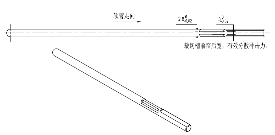 軟管擠出成型后,根據(jù)不同材料依次進行水處理等工藝后,進入剖開步驟。為了保證產(chǎn)品開口整齊、所以要求必須是在產(chǎn)品熱溫下進行剖口。規(guī)定剖開工裝與擠出設備之間的距離需保證在1-1.5米之間。如果不是在線開口、而是從倉庫內(nèi)取出已生產(chǎn)完,未剖開的產(chǎn)品,則開口前必須進行80-90度開水煮3-5分鐘;并且剖開工序需在泡水后10-20分鐘內(nèi)完成。開口前對開口的刀片進行檢查、看是否有損壞、缺口、不夠鋒利等,如有,則開口前必須進行更換刀片后再進行剖開作業(yè)。軟管進入剖開工裝,依靠的動力是是雙皮帶輪帶動軟管前進,前進速度為50厘米/秒,經(jīng)驗證,此速度下軟管所受沖擊力最小。設定后固定速度帶動軟管套入工裝的導向軸上,在軟管靠近破口刀時,會產(chǎn)生巨大推力。同時,雙刀的間隙為3毫米會造成軟管剛接觸刀片時卡住的情況。設計時,將導向軸上設置前窄后寬的兩條槽,即兩條裁切槽,裁切槽前后尺寸相差0.2毫米,如圖3。將兩把破口刀靠在槽上,使雙刀的放置形成前窄后寬的形式,使得軟管與雙刀接觸時受較小的沖擊力,后隨著兩槽間隙的逐漸增大而逐漸增大,有效分散沖擊力,不易產(chǎn)生卡住的情況。